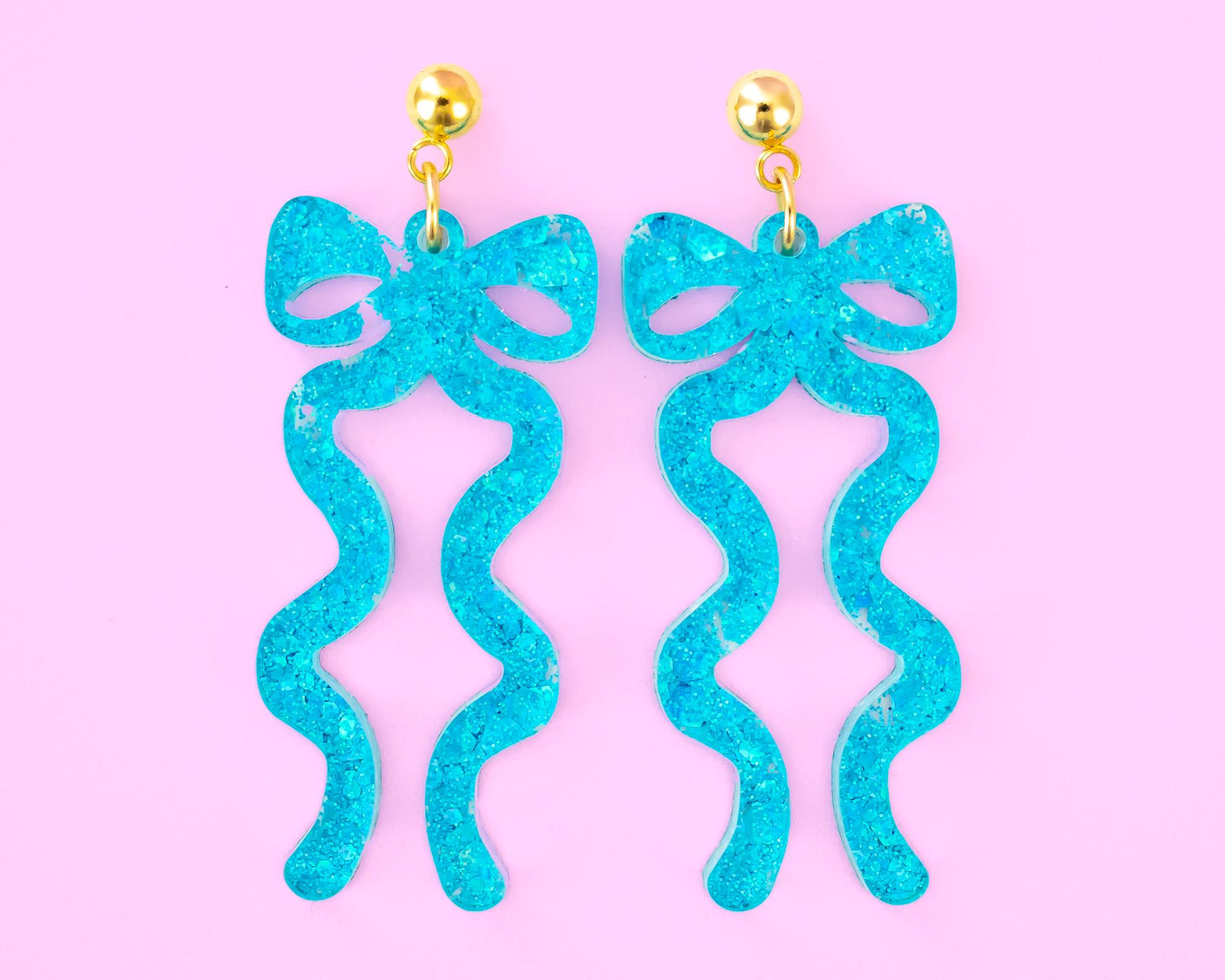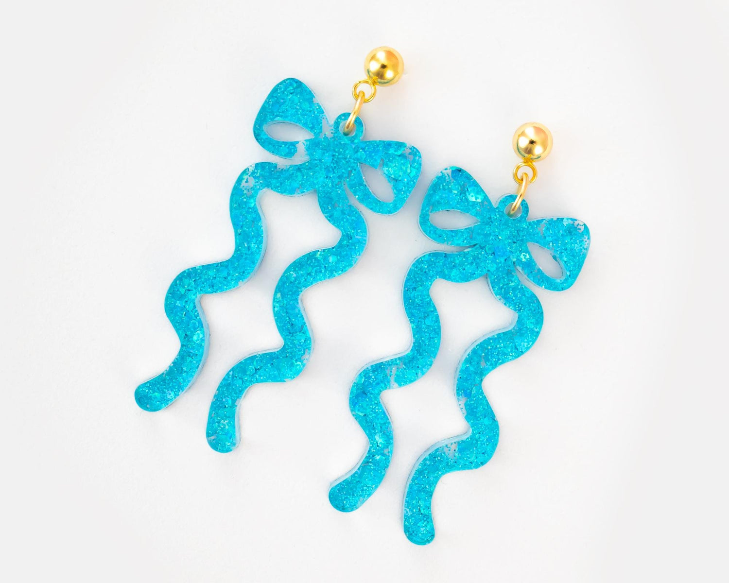 These glitter bow earrings are the perfect accessory to add an extra pop to your outfit! Acrylic is very lightweight so you can enjoy large, statement earrings comfortably all day.