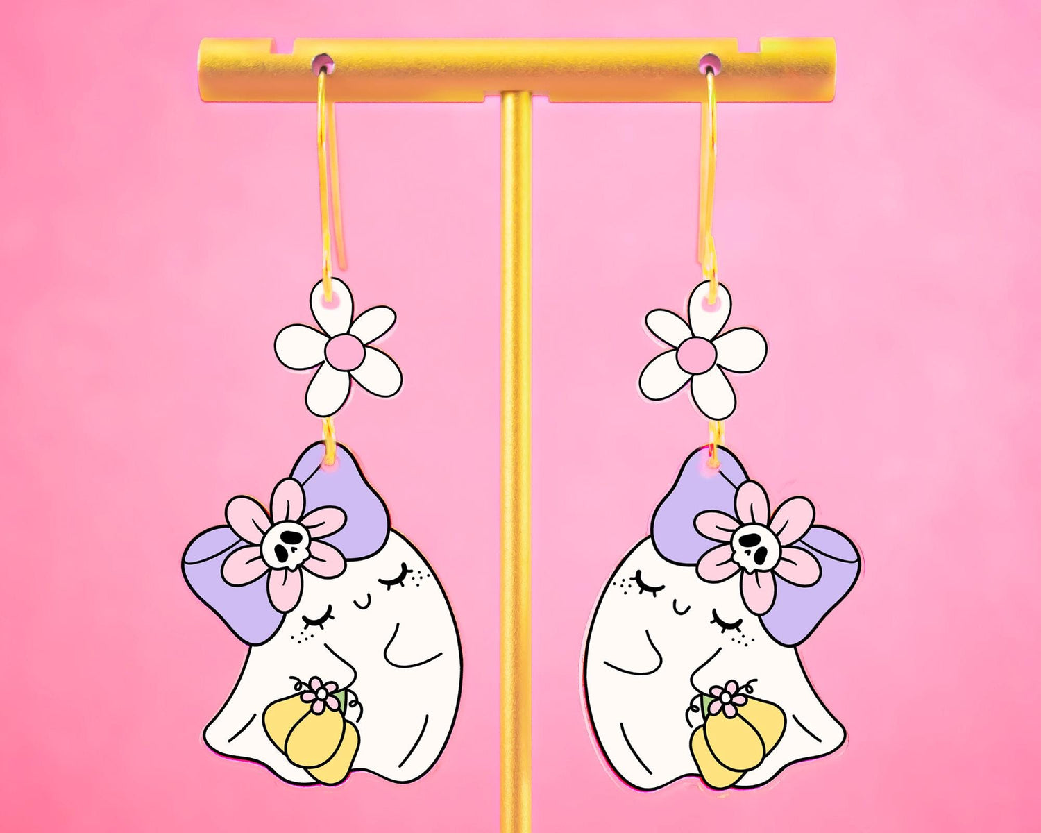 These light-weight acrylic cute bow ghosts earrings are the perfect statement earrings to add an extra pop to your outfit! Acrylic is very lightweight so you can enjoy large, statement earrings comfortably all day.