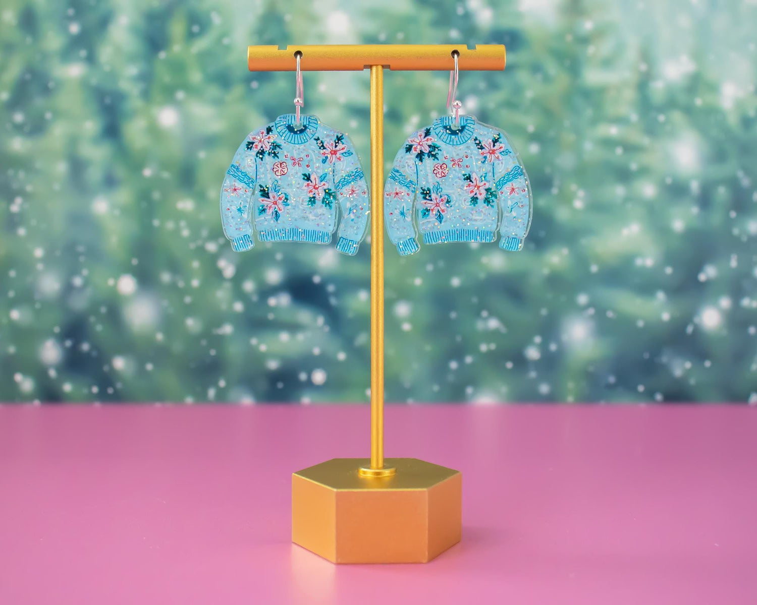 These light-weight ugly Christmas sweater acrylic earrings are the perfect statement earrings to add an extra pop to your outfit! Acrylic is very lightweight so you can enjoy large, statement earrings comfortably all day.