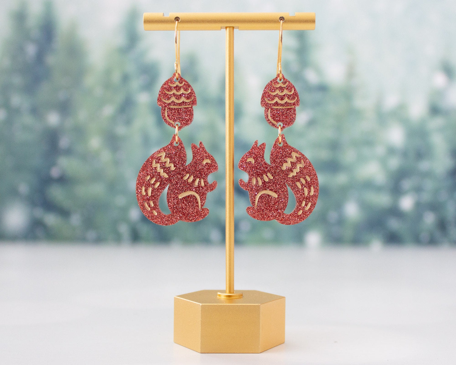 These light-weight statement squirrel dangles are the perfect statement earrings to add an extra pop to your outfit! Acrylic is very lightweight so you can enjoy large, statement earrings comfortably all day.